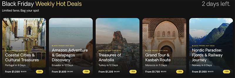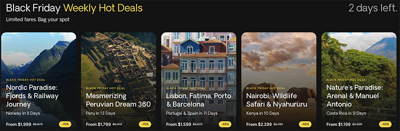 We bring you extraordinary group travel packages to exotic destinations. Get up to 70% off this Black Friday and turn "one day" into today!