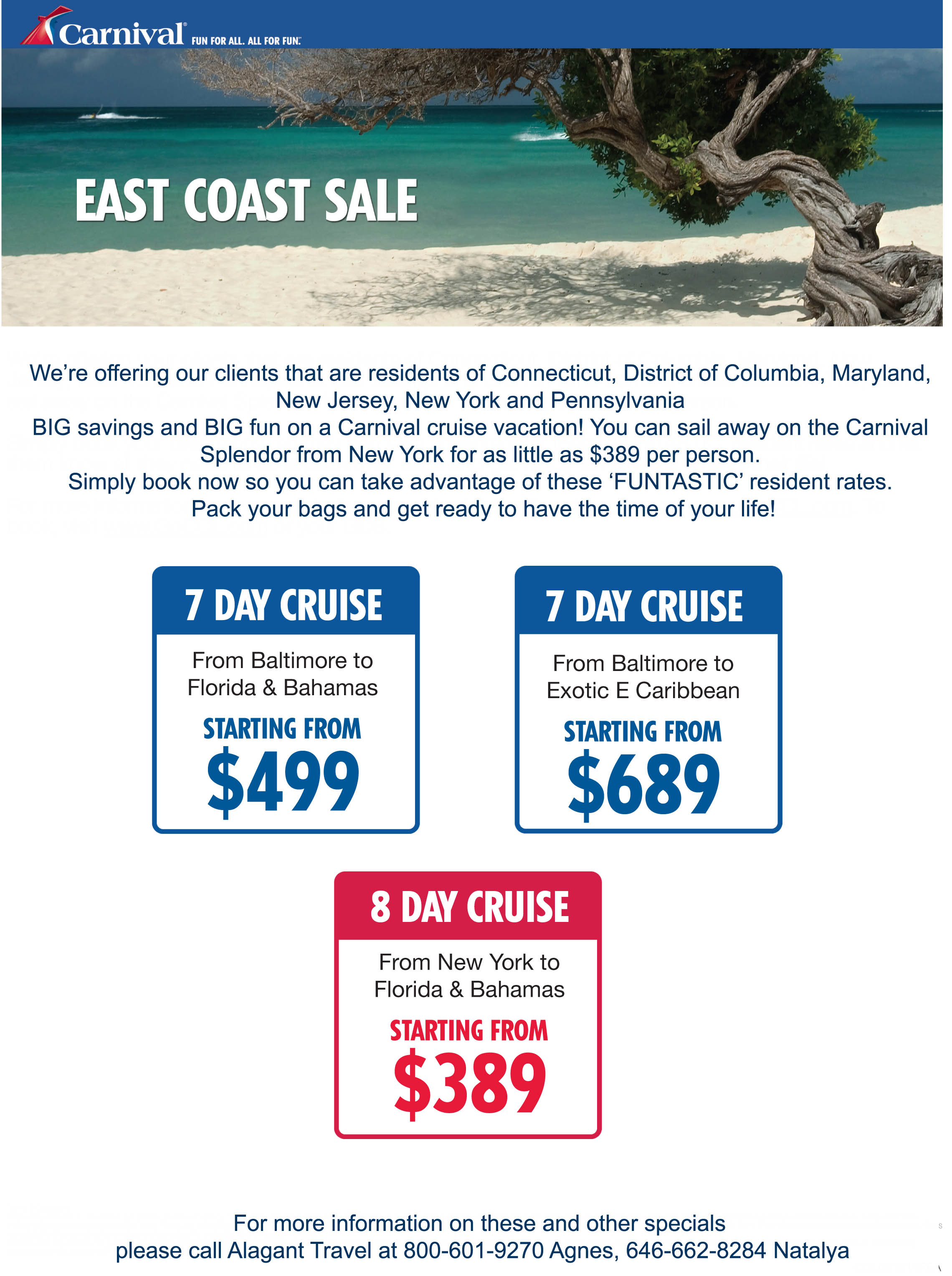 We’re offering our clients that are residents of Connecticut, District of Columbia, New Jersey, New York and Pennsylvania BIG savings and BIG fun on a Carnival cruise vacation.