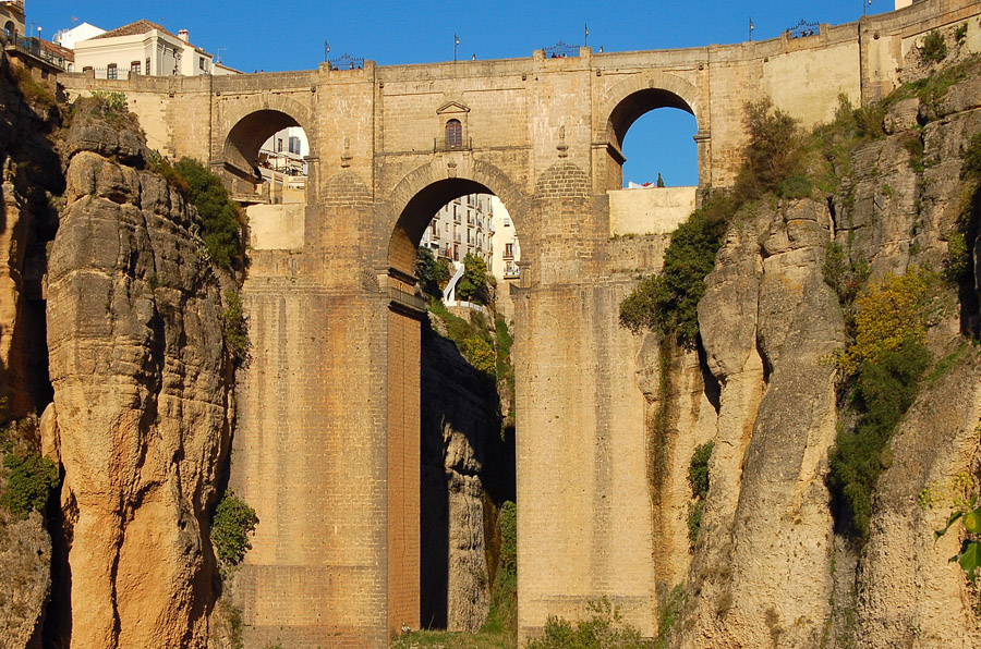 Можно забраться еще выше в горы, по серпантину, мимо скал, напоминающих замки, мимо замков, вросших в эти скалы. И, наконец, оказаться в старинном, расколотом надвое глубоким ущельем городке Рондо. Там древняя крепость на скале, виноградные поля внизу и, несмотря на обилие туристов, приличествующая этим строгим горным красотам тишина.