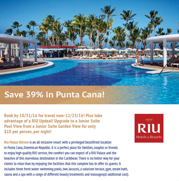 Travel now-12/23/16 and save 39% at Riu Palace Bavaro!
