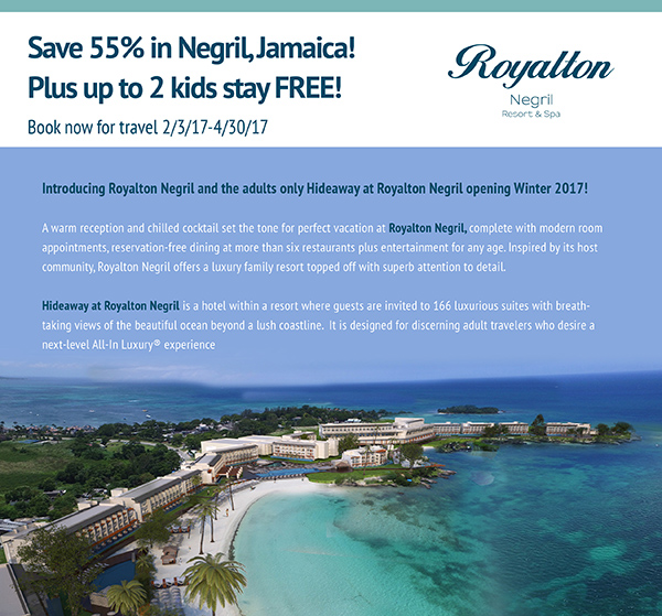 Save 55% in Royalton Negril, Jamaica! Plus up to 2 kids stay FREE!