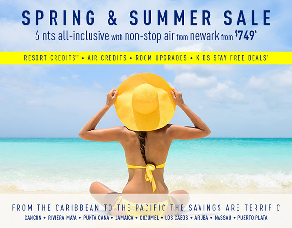If you're dreaming of warmer weather, just wait until you see these hot deals! We are excited to bring you added values and incredible rates on our all-inclusive resorts in the Caribbean and Mexico. Cool off from the hot savings in pristine ocean waters, sprawling pools and kids pool areas with waterparks! Kick your spring or summer off the right way with an unforgettable trip to paradise!