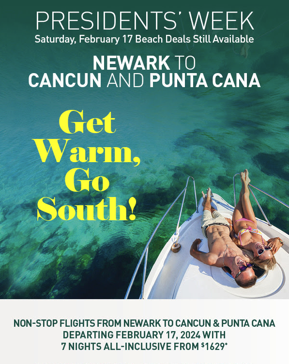 Даты для Нью-Йорка, Нью-Джерси и Пенсильвании (для других штатов и городов - по запросу): 17 февраля - 24 февраля 2024 года, 7-дневный отдых "все включено" в лучших резортах Мексики или Доминиканской республики, прямой и удобный специальный рейс из Ньюарка - от $1629